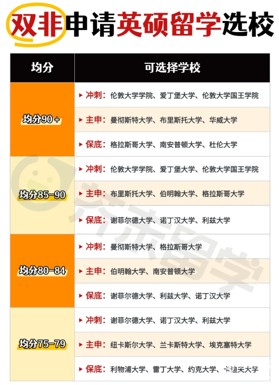 根据自己的院校背景、专业、GPA、语言等各方面因素对照好,大致整理了不同均分的主申、冲刺和保底的学校。